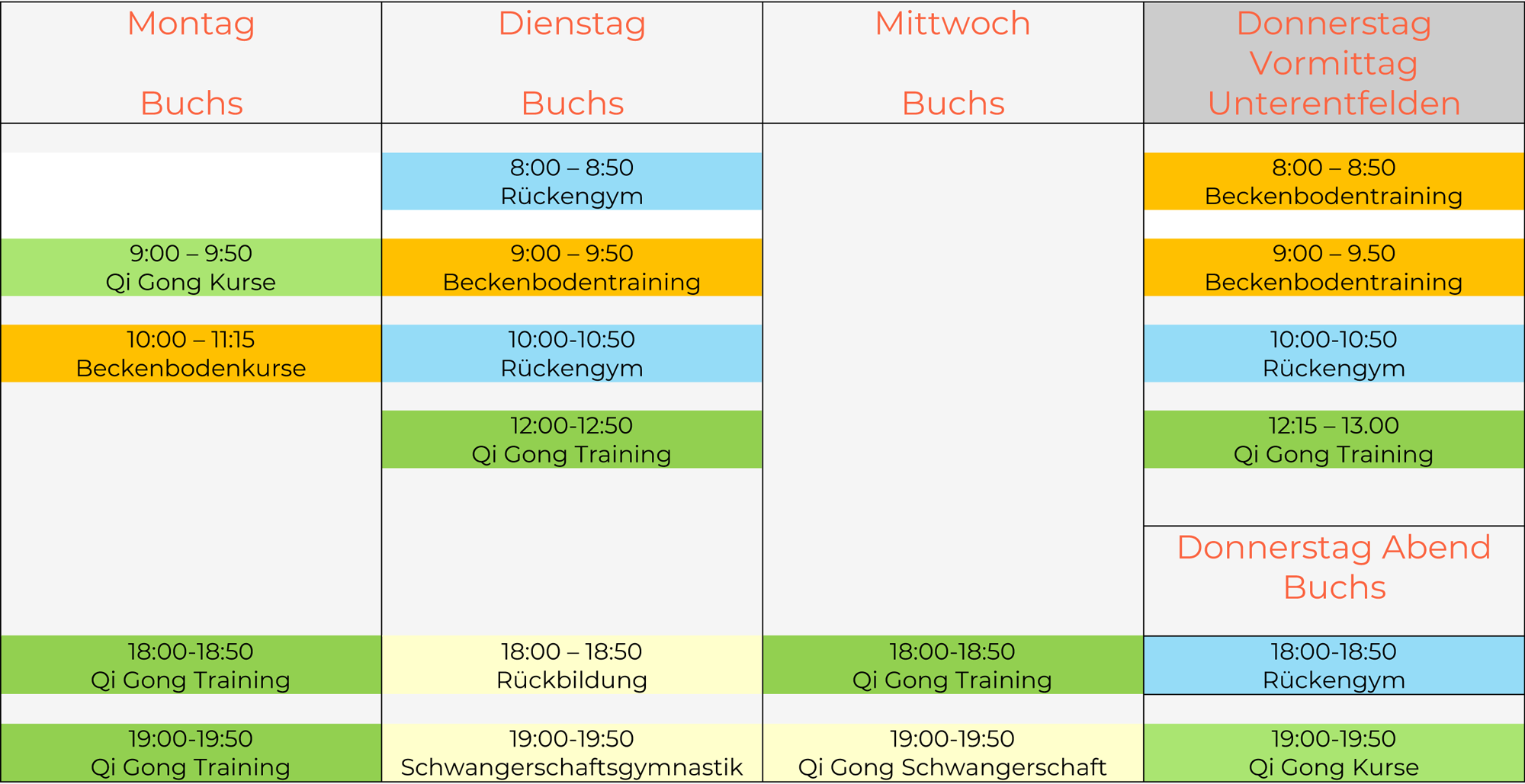 - Im Dezember fallen alle Dienstag-Vormittagslektionen aus - diese Trainings sind auf Montag verlegt - Rückengym 8:00 - 8:50, QG 9:00 - 9:50, Beckenbodentraining 10:00-10:50 - die Abendkurse finden planmässig statt.